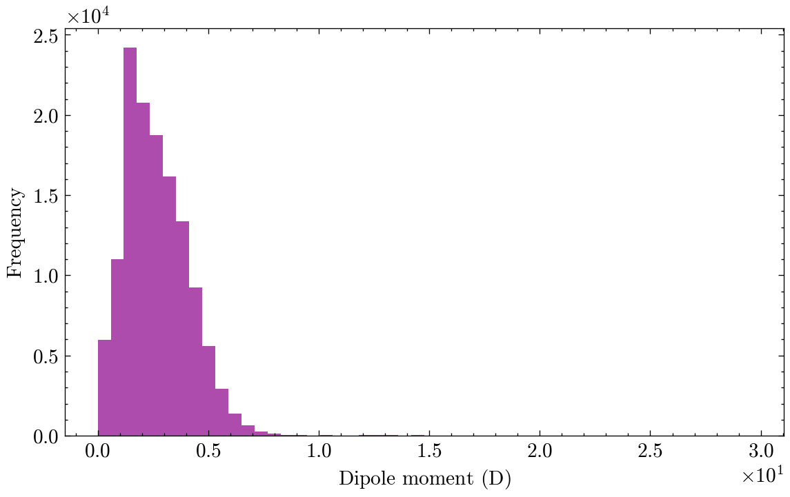 Among the 19 properties in QM9, we will focus on one in particular: the dipole moment, \(\mu\). In simple terms, a molecule’s dipole moment is a measure of its overall polarity. It arises from the unequal sharing of electrons between atoms in a chemical bond. Some atoms, such as oxygen and fluorine, are more electronegative, meaning they pull electrons more strongly toward themselves. When a bond forms between atoms with different electronegativities, the electrons spend more time around the more electronegative atom. This creates a slight negative charge on that atom and a slight positive charge on the less electronegative one. This separation of charge is called a bond dipole.